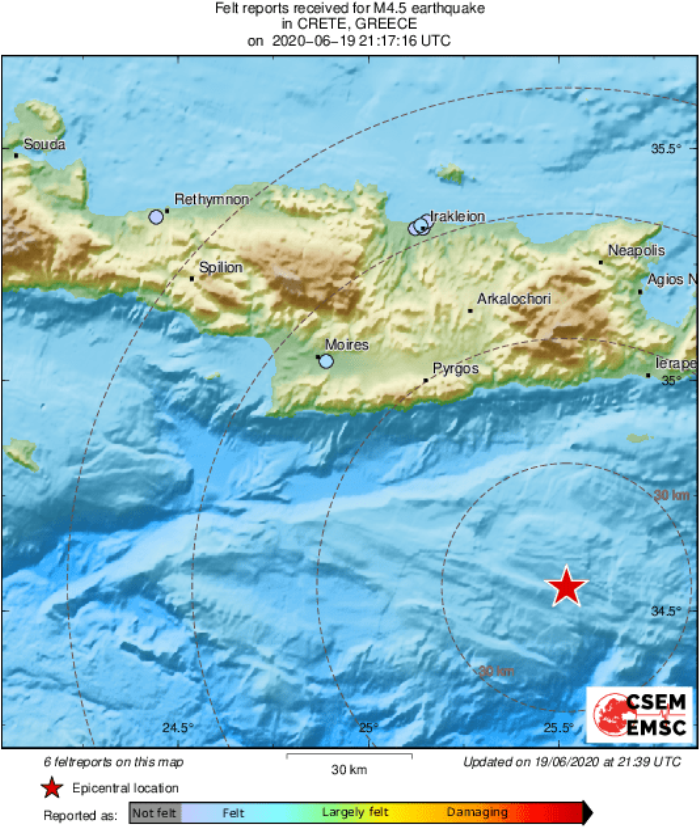 - Στις 23:34 Μέγεθος: 4.4 R Επίκεντρο: 56 χλμ Νότια της Άρβης Ηρακλείου Κρήτης Εστιακό Βάθος: 20 χλμ