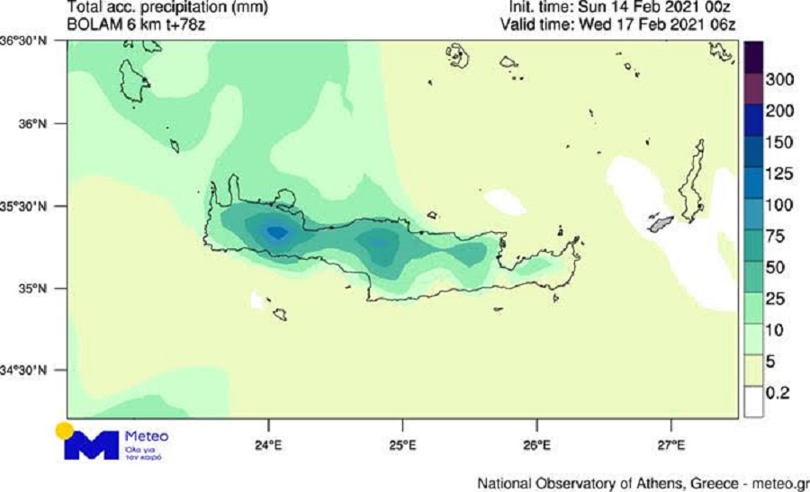 Ο χάρτης που ακολουθεί δίνει το εκτιμώμενο ύψος βροχής/χιονιού μέχρι τις πρωινές ώρες της Τετάρτης, όπως υπολογίζεται από το προγνωστικό μετεωρολογικό μοντέλο του Εθνικού Αστεροσκοπείου Αθηνών/meteo.gr.