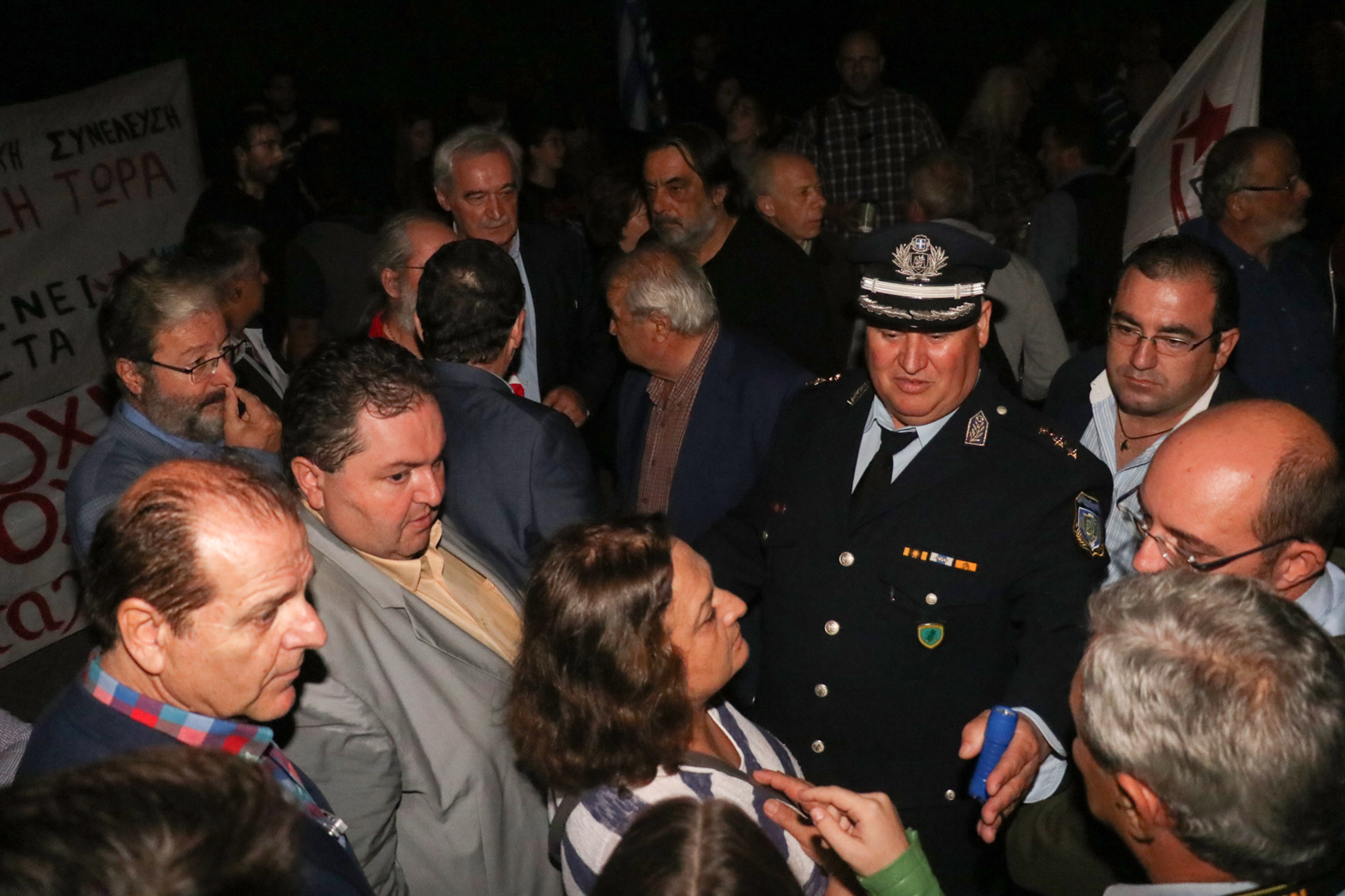 Μέλη του Εθνικού Συμβουλίου Διεκδίκησης των Οφειλών της Γερμανίας προς την Ελλάδα, ο ευρωβουλευτής Νότης Μαριάς, ο ευρωβουλευτής Νίκος Χουντής, ο πρόεδρος της ΛΑΕ Παναγιώτης Λαφαζάνης, ο πρόεδρος του Εργατικού Κέντρου Ηρακλείου Στελιος Βοργιάς, τοπικοί φορείς και πολίτες, διαμαρτύρονται για την πραγματοποίηση της ελληνογερμανικής συνέλευσης, για την οποία δεκάδες φορείς, κόμματα, δημοτικές παρατάξεις και σύλλογοι ζήτησαν την ακύρωσή της.