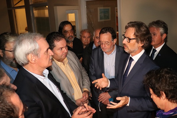 (Ο πρεσβευτής της Γερμανίας στην Αθήνα Γενς Πλέτνερ ακούει τις διαμαρτυρίες του Ευρωβουλευτή Νίκου Χουντή, του Μέλους του Εθνικού Συμβουλίου Διεκδίκησης των Οφειλών της Γερμανίας προς την Ελλάδα Αριστομένη Συγγελάκη και του προέδρου της Λαϊκής Ενότητας Παναγιώτη Λαφαζάνη)