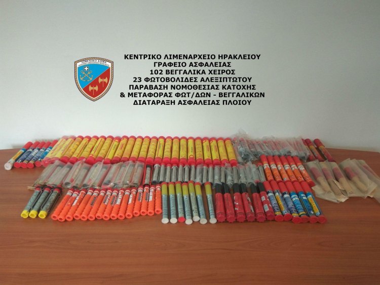 Συγκεριμένα σε έλεγχο που διενεργήθηκε στον ανωτέρω από στελέχη του Γραφείου Ασφάλειας, κατά την παραλαβή δύο (02) ασυνόδευτων δεμάτων από Ε/Γ-Ο/Γ πλοίο στο λιμένα Ηρακλείου, εντοπίστηκαν και κατασχέθηκαν εντός των δεμάτων, εκατόν δύο (102) βεγγαλικά χειρός ναυτικού τύπου ερυθρού χρώματος καθώς και είκοσι τρεις (23) φωτοβολίδες αλεξίπτωτου.