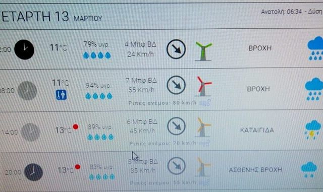 Τις πρωινές ώρες προβλέπεται καιρός με αυξημένες νεφώσεις, το μεσημέρι ενώ τις βραδινές ώρες αυξημένες νεφώσεις και βροχοπτώσεις με πιθανότητα καταιγίδας. Άνεμος μεταβλητός 2 έως 3 μποφόρ απο Β έως ΒΒΔ διευθύνσεις. H Θερμοκρασία θα κυμανθεί από 9 έως 18 βαθμούς Κελσίου, ενώ στα ορεινά από 4 έως 12 βαθμούς Κελσίου