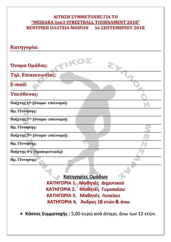 Μεγάλο Τουρνουα Streetball διοργανώνει ο ΓΑΣ Μεσσαράς στην Κεντρική Πλατεία Μοιρων την Κυριακή 16 Σεπτεμβρίου για όλες τις ηλικίες. Το τουρνουά διοργανώνεται στα πλαίσια της προώθησης του αθλήματος στην ευρύτερη περιοχή της Μεσσαράς. "Messara 3on3 Streetball Tournament 2018" είναι η γιορτή του μπάσκετ που διοργανώνει ο ΓΑΣ ΜΕΣΣΑΡΑΣ-ΤΜΗΜΑ ΚΑΛΑΘΟΣΦΑΙΡΙΣΗΣ την Κυριακή 16 Σεπτεμβρίου στην Κεντρική Πλατεία Μοιρών.