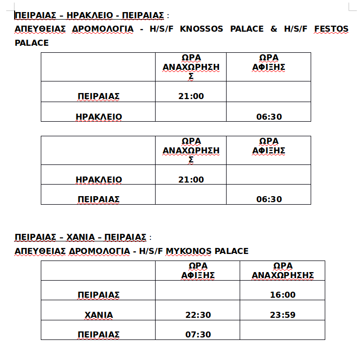 Οι Μινωικές Γραμμές με ανακοίνωσή τους κάνουν γνωστό πως ολοκληρώθηκε η διαδικασία εγκατάστασης συσκευών καθαρισμού καυσαερίων (SCRUBBERS) και από την Τετάρτη 12 Ιουνίου 2019, συνδέουν καθημερινά το Ηράκλειο, τα Χανιά και τον Πειραιά με απευθείας δρομολόγια, σύμφωνα με το παρακάτω πρόγραμμα: