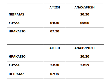 Για το λόγο αυτό, οι Μινωικές Γραμμές ενημερώνουν το επιβατικό κοινό ότι θα προχωρήσουν σε τροποποιήσεις δρομολογίων από την Τετάρτη 09/01/2019 έως και την Πέμπτη 18/04/2019 με καθημερινές αφίξεις και αναχωρήσεις από τα λιμάνια Πειραιά, Σούδας και Ηρακλείου, σύμφωνα με το παρακάτω πρόγραμμα: