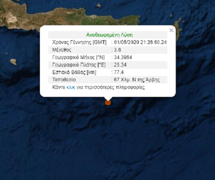 Σεισμική δόνηση μεγέθους 3,6 βαθμών της Κλίμακας Ρίχτερ, σύμφωνα με την αναθεωρημένη λύση του Γεωδυναμικού Ινστιτούτου, σημειώθηκε στις 26 λεπτά μετά τα μεσάνυχτα νότια της Κρήτης, και συγκεκριμένα στον θαλάσσιο χώρο, 67 χιλιόμετρα νότια της Άρβης.