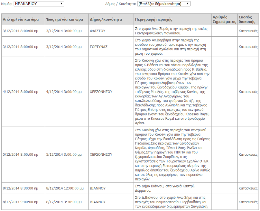 Διακοπές ρεύματος θα σημειωθούν σε περιοχές του Ηρακλείου από σήμερα 3 Δεκεμβρίου μέχρι και τις 8 του μήνα, σύμφωνα με το πρόγραμμα διακοπών ρεύματος του ΔΕΔΗΕ. Συγεκριμένα οι διακοπές αφορούν στις εξής περιοχές:
