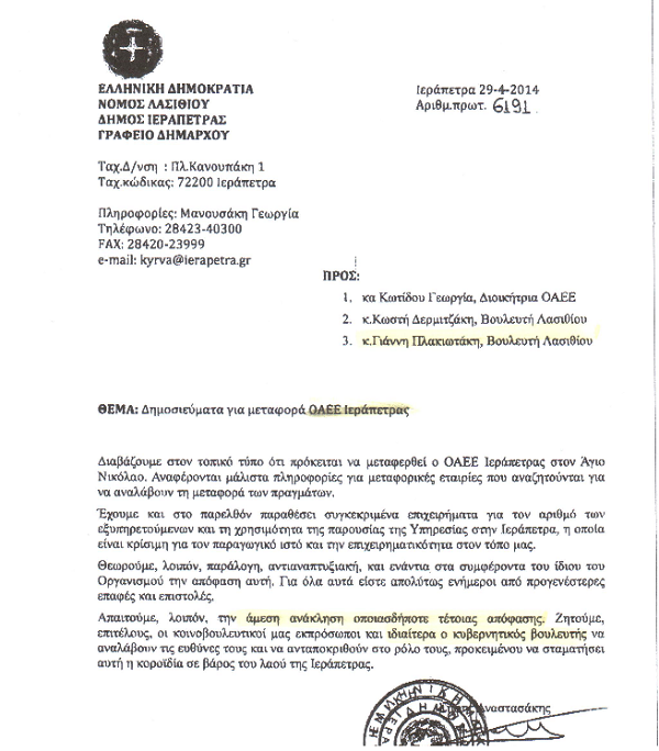 Αναφορά προς τον υπουργό Εργασίας, Κοινωνικής Ασφάλισης και Πρόνοιας κ. Βρούτση κάνει ο βουλευτής Λασιθίου της ΝΔ κ. Γιάννης Πλακιωτάκης με αφορμή δημοσιεύματα που θέλουν τον ΟΑΕΕ Ιεράπετρας να μεταφέρεται σε άλλη πόλη και του ζητεί να εξετάσει το θέμα προσεκτικά.