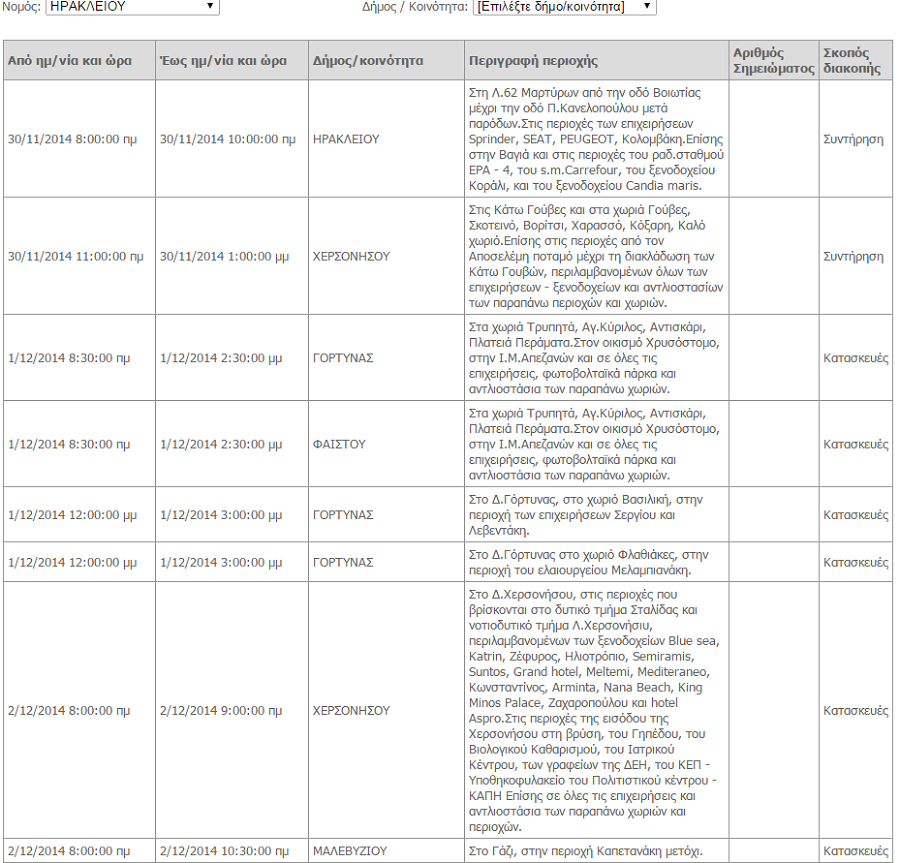 Διακοπές ρεύματος σε διάφορες περιοχές του Ηρακλείου θα σημειωθούν από σήμερα 30 Νοεμβρίου μέχρι και την Τρίτη 2 Δεκεμβρίου σύμφωνα με το πρόγραμμα διακοπών ρεύματος του ΔΕΔΗΕ. Οι περιοχές στις οποίες θα υπάρξει διακοπή στην ηλεκτροδότηση είναι οι εξής: