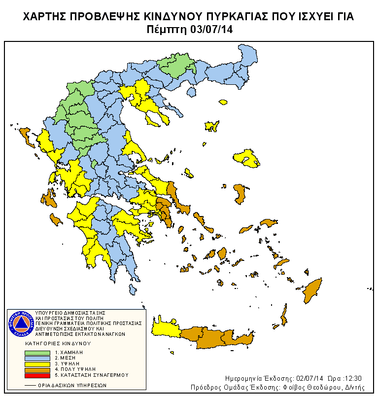 Πολύ υψηλός είναι ο κίνδυνος για εκδήλωση πυρκαγιάς στην Κρήτη σήμερα Πέμπτη 3 Ιουλίου 2014. Σύμφωνα με τον χάρτη πρόβλεψης κινδύνου πυρκαγιάς της Γενικής Γραμματείας Πολιτικής Προστασίας, ο βαθμός επικινδυνότητα για την Κρήτη είναι στο 4 εκτός από το Νομό χανίων όπου εκεί ο βαθμός είναι στο 3 (υψηλός) Να σημειωθεί ότι ο ακριβώς επόμενος βαθμός, βαθμός 5, σημαίνει Κατάσταση Συναγερμού.
