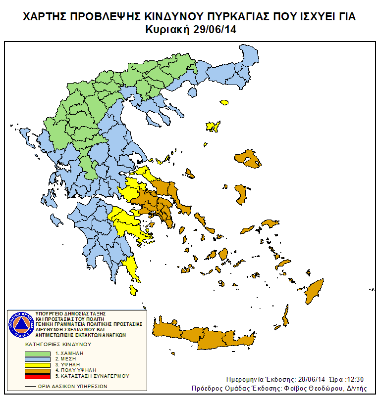 Πολύ υψηλός είναι ο κίνδυνος για εκδήλωση πυρκαγιάς στην Κρήτη σήμερα Κυριακή 29 Ιουνίου 2014. Σύμφωνα με τον χάρτη πρόβλεψης κινδύνου πυρκαγιάς της Γενικής Γραμματείας Πολιτικής Προστασίας, ο βαθμός επικινδυνότητα για την Κρήτη είναι στο 4. να σημειωθεί ότι ο ακριβώς επόμενος βαθμός, βαθμός 5, σημαίνει Κατάσταση Συναγερμού. Σύμφωνα με την ΕΜΥ για σήμερα Κυριακή ο καιρός στην Κρήτη προβλέπεται γεινκά αίθριος με ανέμους που θα φτάσουν τα 5 μποφόρ και θερμοκρασία που θα κυμανθεί από 23 έως 26 βαθμούς Κελσίου.