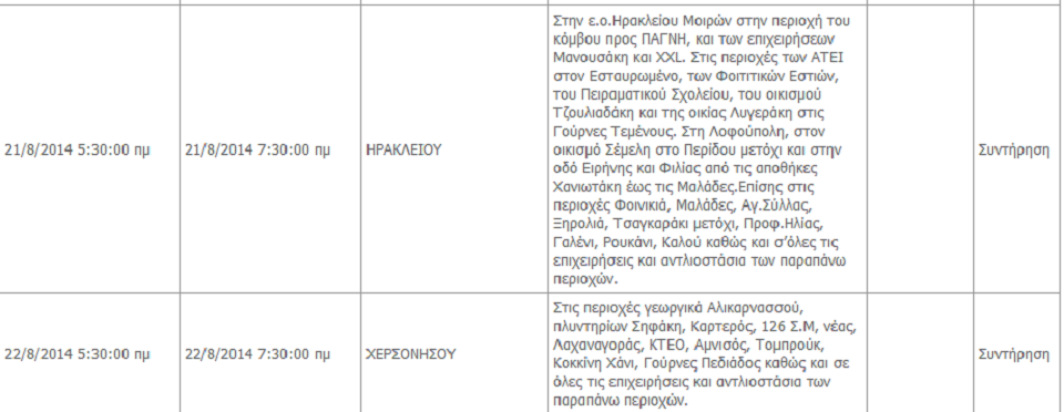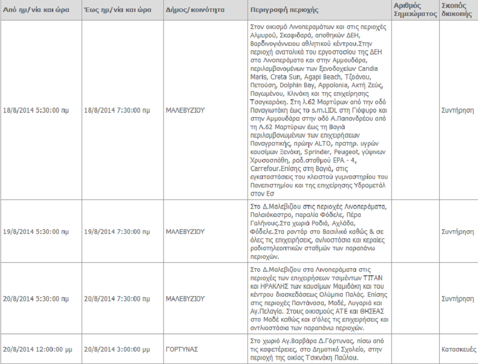 Σε προγραμματισμένες διακοπές ρεύματος θα προχωρήσει η ΔΕΔΗΕ στο Ηράκλειο από την Κυριακή 18 Αυγούστου μέχρι και την Παρασκευή 22 του μήνα. δείτε παρακάτω αναλυτικά τις περιοχές και τις ώρες όπου θα σημειωθούν διακοπές ρεύματος.