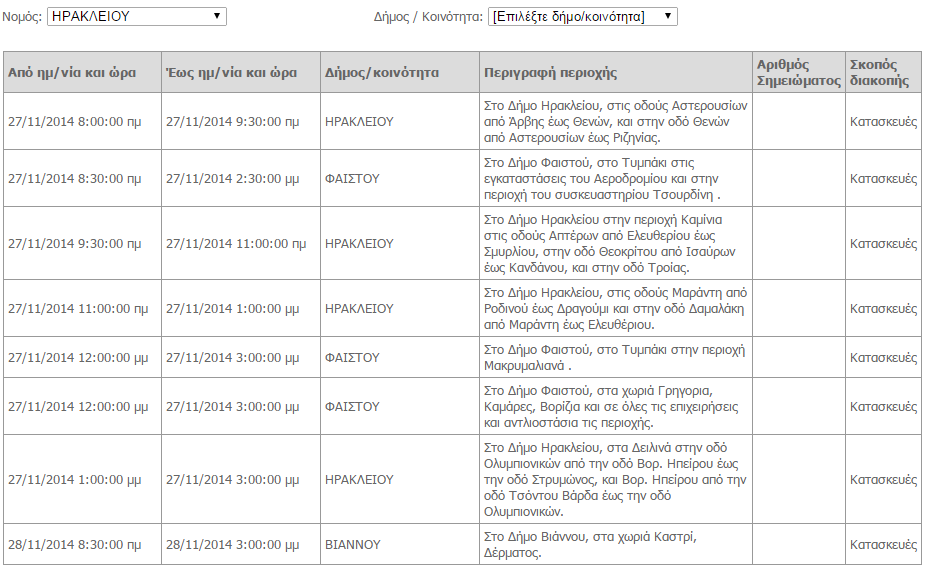 Διακοπές ρεύματος θα σημειωθούν την Πέμπτη 27 και Παρασκευή 28 Νοεμβρίου σε περιοχές του Ηρακλείου. Συγκεκριμένα: