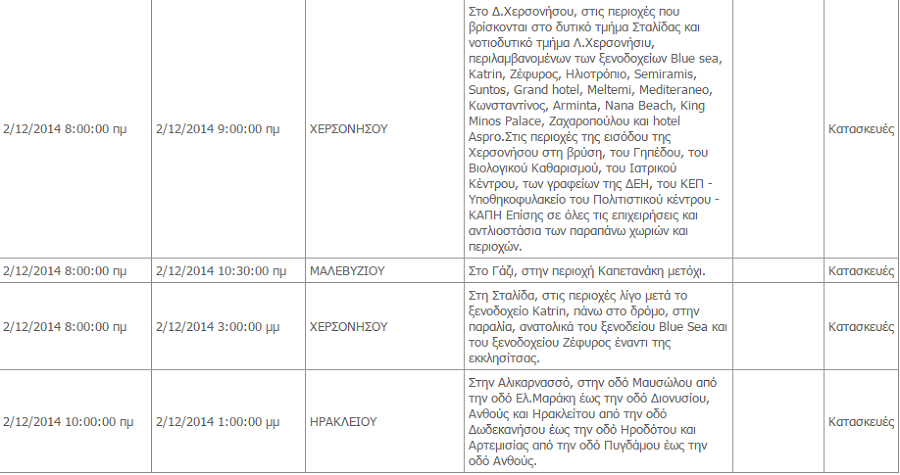Διακοπές ρεύματος θα σημειωθούν την Τρίτη 2 Δεκεμβρίου 2014 σε περιοχές του Ηρακλείου σύμφωνα με το πρόγραμμα του ΔΕΔΗΕ. Αυτές είναι οι εξής: