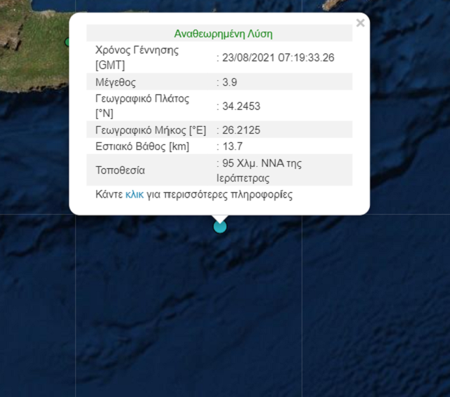 Σύμφωνα με το Γεωδυναμικό Ινστιτούτο του Εθνικού Αστεροσκοπείου Αθηνών, η δόνησησημειώθηκε στι; 10.19 το πρωί και το επίκεντρο εντοπίζεται 95 χλμ Νότια-Νοτιοανατολικά της Ιεράπετρας.