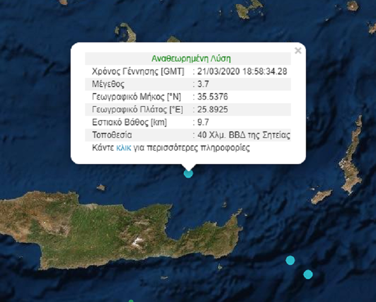 Σεισμική δόνηση έντασης 3,7 βαθμών της Κλίμακας Ρίχτερ σημειώθηκε δύο λεπτά πριν τις 9 το βράδυ του Σαββάτου, στην Κρήτη.