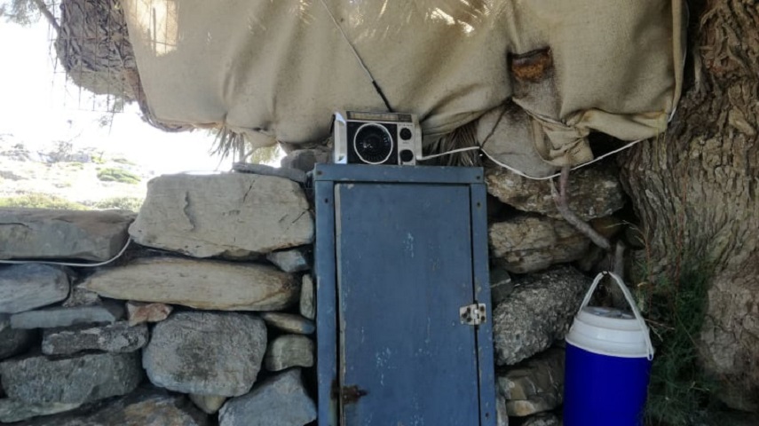 Κάτω από ένα τεράστιο αλμυρίκι έχει διαμορφωθεί ένας πρόχειρος χώρος …καλοκαιρινής διαμονής στον οποίο ξεχωριστεί θέση έχει το ραδιόφωνο που είναι συντονισμένο στους 101,5 στη συχνότητα του Ράδιο Κρήτη και έτσι όλοι οι λουόμενοι ακούν τις εκπομπές του.