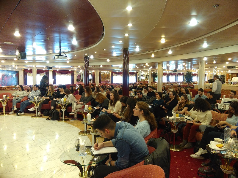 φοιτητές του εργαστηρίου, παρουσία της εισηγήτριας τους κας Λίνας Κυριακού, να παρακολουθήσουν μία ενημερωτική παρουσίαση στο συνεδριακό σαλόνι του πλοίου Mykonos Palace, Τετάρτη 10 Απριλίου 2019.