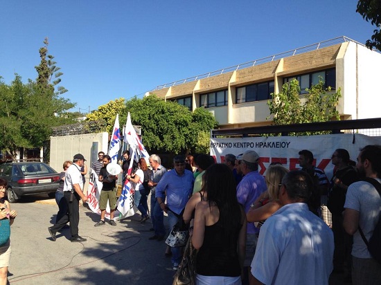 Στο πλευρό των εργαζομένων μέλη του ΠΑΜΕ, ενώ στα κάγκελα υπάρχει αναρτημένο ένα μεγάλο πανό από το Εργατικό Κέντρο Ηρακλείου, ενώ επί τόπου βρίσκονταν και μέλη της διοίκησης.