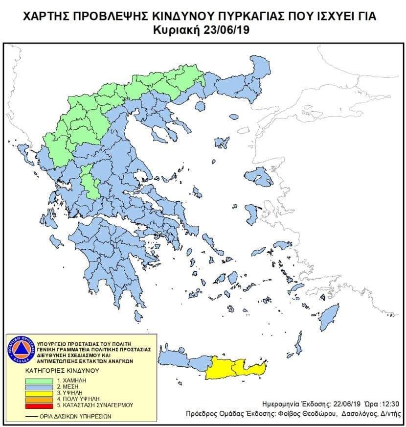 Υψηλός σε δύο νομούς της Κρήτης προβλέπεται για σήμερα ο κίνδυνος εκδήλωσης πυρκαγιάς, σύμφωνα με τον χάρτη που εκδίδει η Γενική Γραμματεία Πολιτικής Προστασίας.