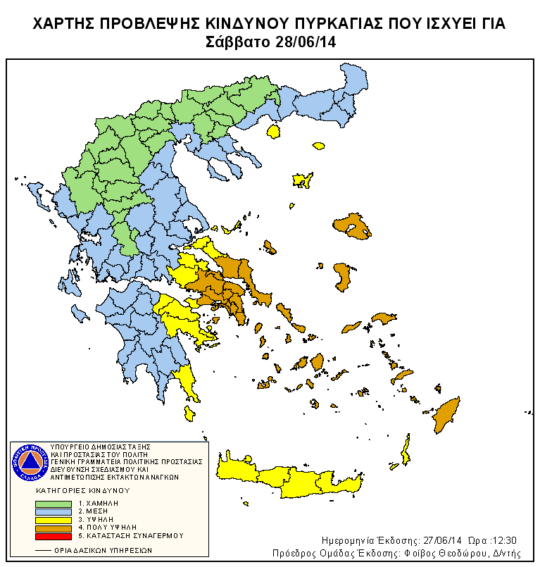 Υψηλός είναι ο κίνδυνος για εκδήλωση πυρκαγιάς στην Κρήτη το Σάββατο 28 Ιουνίου σύμφωνα και με τον χάρτη πρόβλεψης κινδύνου πυρκαγιάς της Γενικής Γραμματείας Πολιτικής Προστασίας. Συγκεκριμένα για την κρήτη ο βαθμός επικινδυνότητας βρίσκεται στο 3 ενώ πολύ υψηλός είναι ο κίνδυνος για τη περιοχή της Πελοποννήσου, της Ανατολικής Στερεάς Ελλάδας, της Αττικής, των Νήσων Βορείου Αιγαίου, των Κυκλάδων και των Δωδεκανήσων, με τον βαθμό να είναι στο 4.