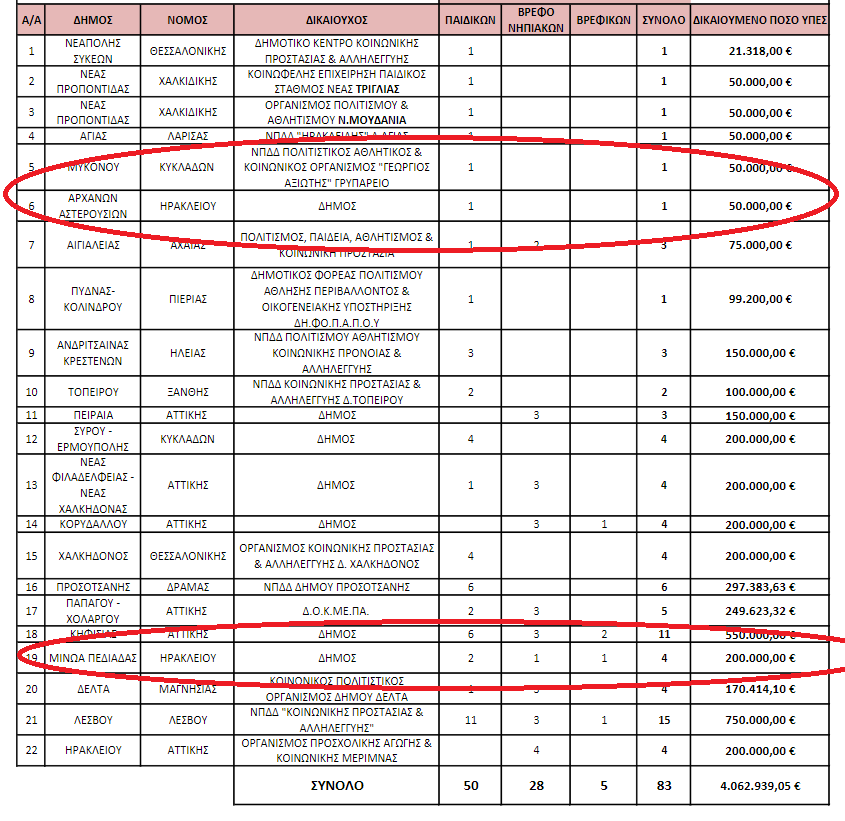 Παρακάτω στον κόκκινο κύκλο οι δήμοι της Κρήτης που θα χρηματοδοτηθούν: