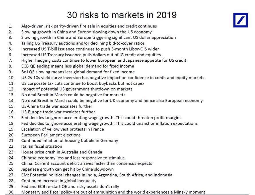 Την ίδια άποψη όπως όλα δείχνουν έχουν και οι αναλυτές της Deutsche Bank, καθώς σε έκθεσή της η γερμανική τράπεζα καταγράφει τους 30 κινδύνους που θα αντιμετωπίσουν αγορές και οικονομίες για το 2019.