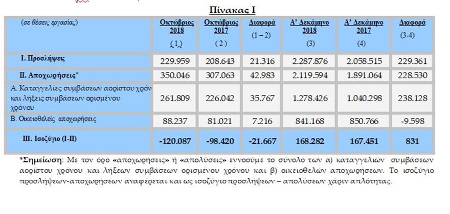 Συγκεκριμένα, σύμφωνα με τα στοιχεία των ροών μισθωτής απασχόλησης του Οκτωβρίου 2018, οι αναγγελίες πρόσληψης ανήλθαν σε 229.959, ενώ οι αποχωρήσεις σε 350.046.