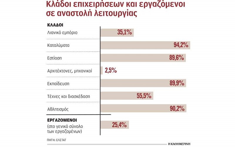 Πολύ υψηλά είναι τα ποσοστά εργαζομένων σε αναστολή σε κλάδους όπως τα καταλύματα (94,2%), ο αθλητισμός (90,2%), η εκπαίδευση (89,9%), η εστίαση (89,6%) τα τυχερά παιχνίδια (87%), η παροχή προσωπικών υπηρεσιών (75,2%).