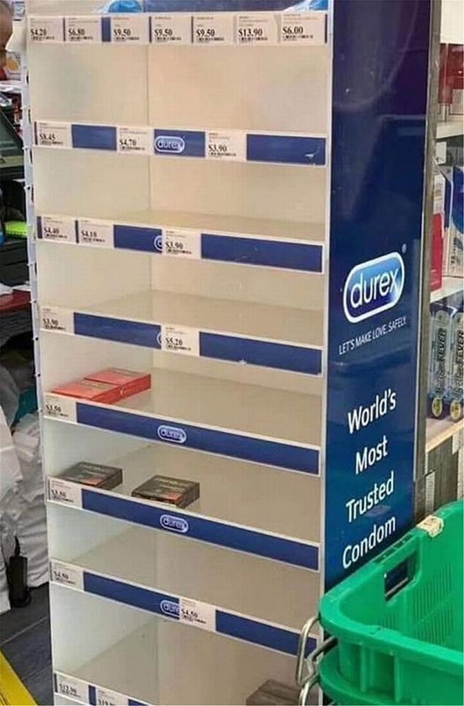Φωτογραφίες που ανεβάζουν χρήστες των social media από την Αυστραλία και τη Σιγκαπούρη απεικονίζουν τα άδεια από προφυλακτικά ράφια στα σουπερμάρκετ.