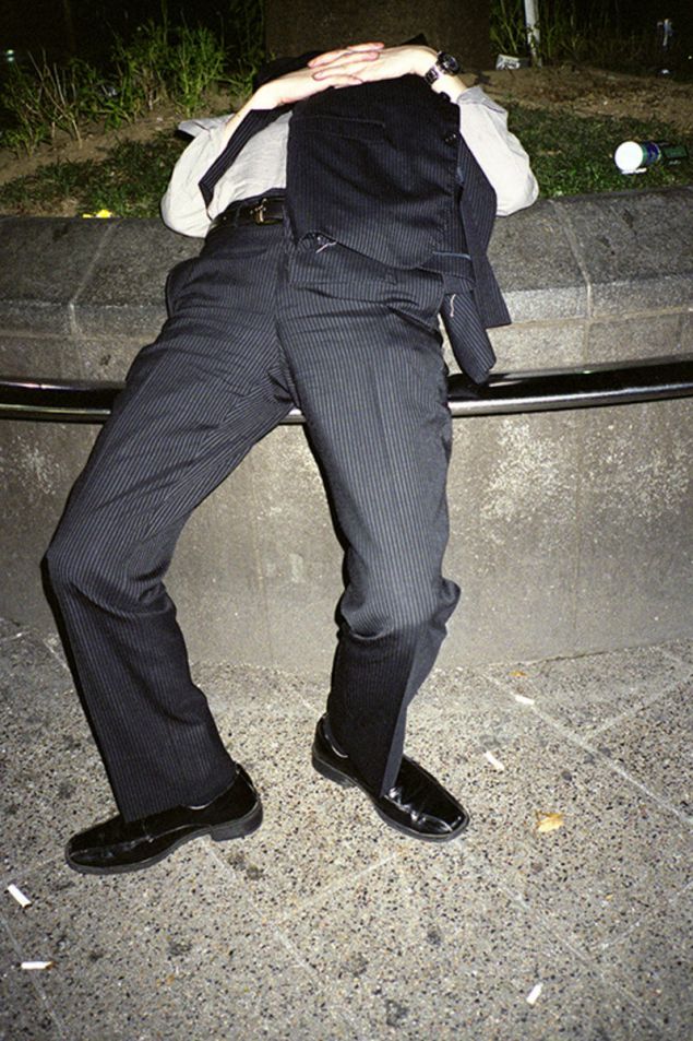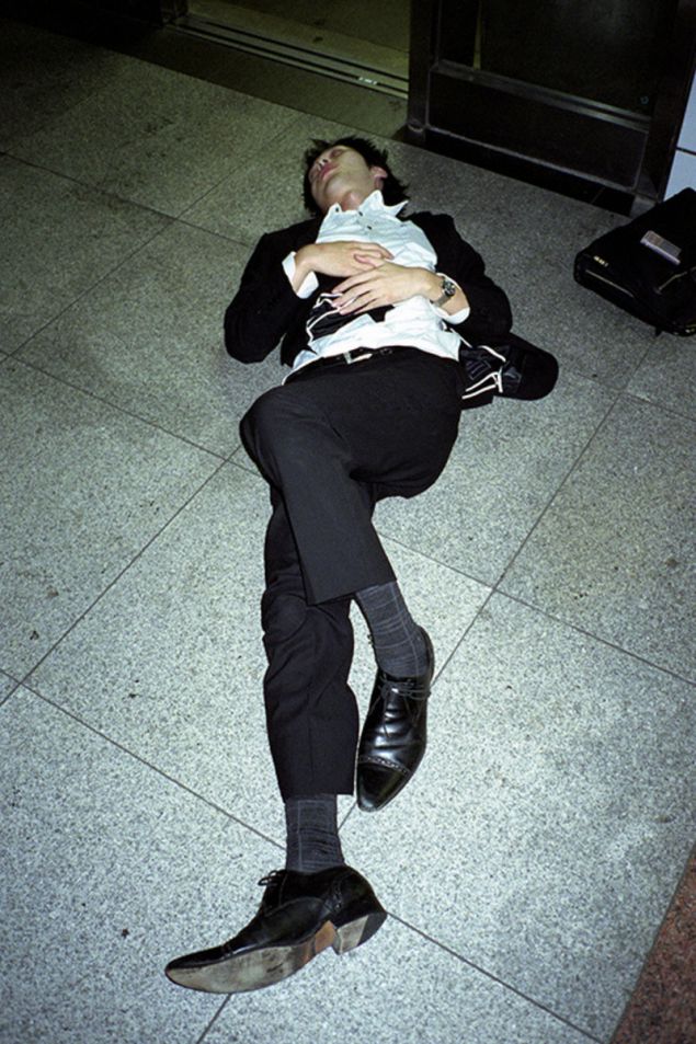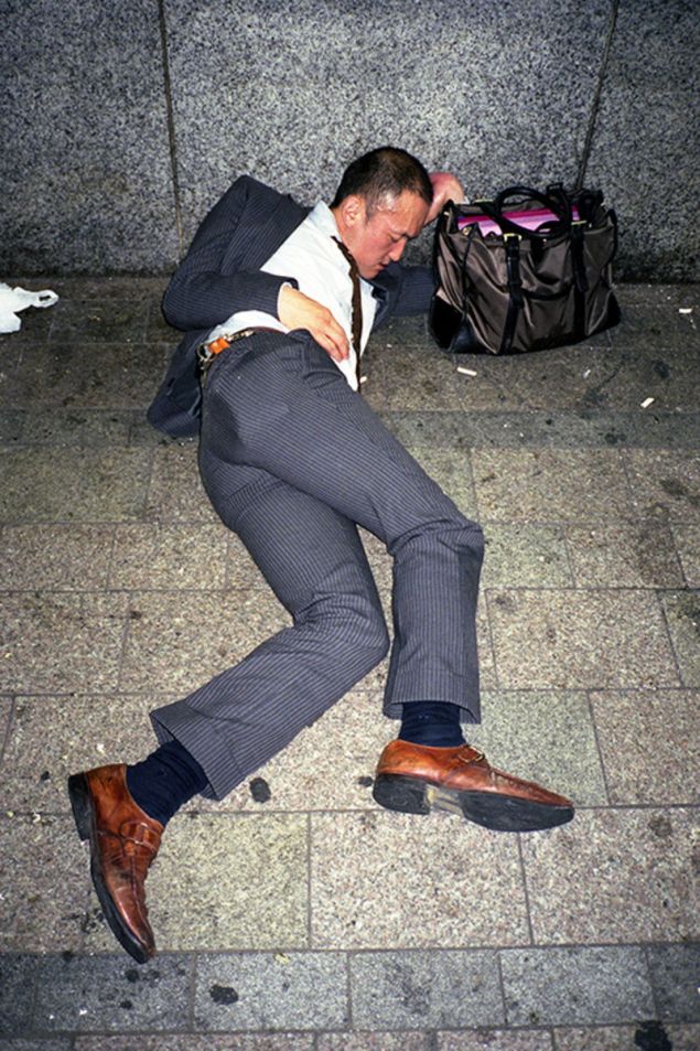 Οι φωτογραφίες σοκάρουν. Καλοντυμένοι Ιάπωνες, κουλουριασμένοι, κοιμούνται στα πεζοδρόμια, περιμένοντας τα μέσα μεταφοράς. Οι «άστεγοι με τα κοστούμια» είναι οι εργαζόμενοι που δουλεύουν μέχρι πολύ αργά το βράδυ και καταρρέουν από την κούραση στον δρόμο της επιστροφής. Είτε τους παίρνει ο ύπνος στη στάση του λεωφορείου ή του τρένου, είτε δεν προλαβαίνουν τα τελευταία δρομολόγια και μη έχοντας χρήματα για πανάκριβα ξενοδοχεία, επιλέγουν να κοιμηθούν σε πεζοδρόμια και παγκάκια.
