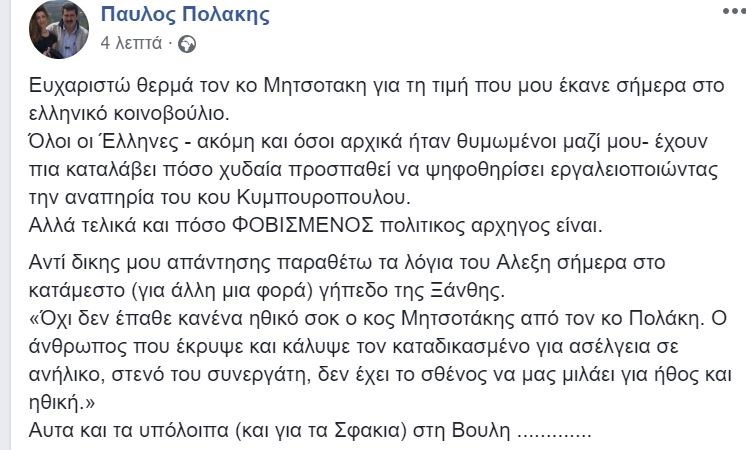 Με ανάρτησή του στην προσωπική του σελίδα στο Facebook, ο Παύλος Πολάκης απάντησε στον Κυριάκο Μητσοτάκη για την κατάθεση πρότασης δυσπιστίας σε βάρος του και στα όσα είπε ο πρόεδρος της Νέας Δημοκρατίας προς το πρόσωπό του.