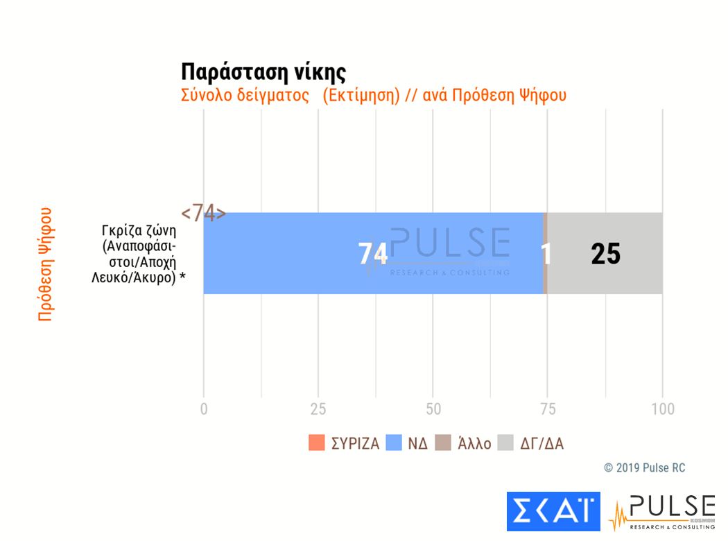 Στην παράσταση νίκης η γκρίζα ζώνη σε ποσοστό 74% απαντά ότι η ΝΔ είναι πιθανό να κερδίσει τις εκλογές και το 25% δεν γνωρίζει/δεν απαντά. Το 1% απαντά άλλο κόμμα.