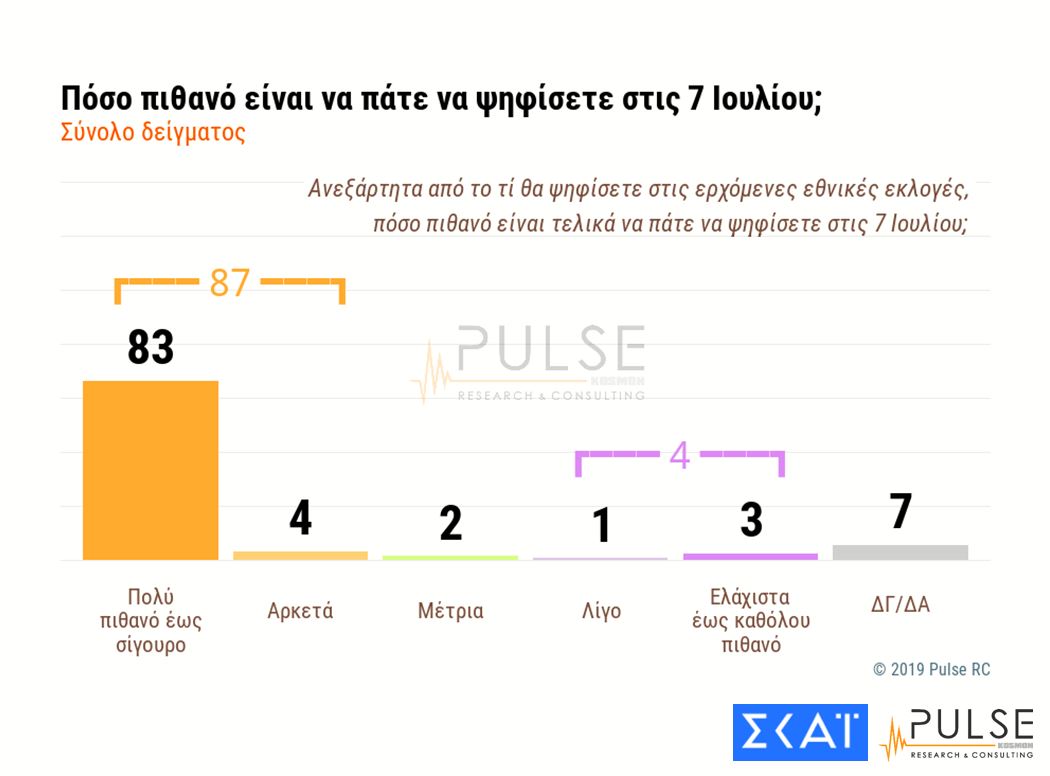 Με βάση τις απαντήσεις φαίνεται ότι η αποχή από τις κάλπες της 7ης Ιουλίου θα είναι χαμηλή. Το 83% δηλώνει ότι είναι πολύ πιθανό έως σίγουρο ότι θα πάει να ψηφίσει και το 3% απαντά ελάχιστα έως καθόλου πιθανό να φτάσει στην κάλπη.