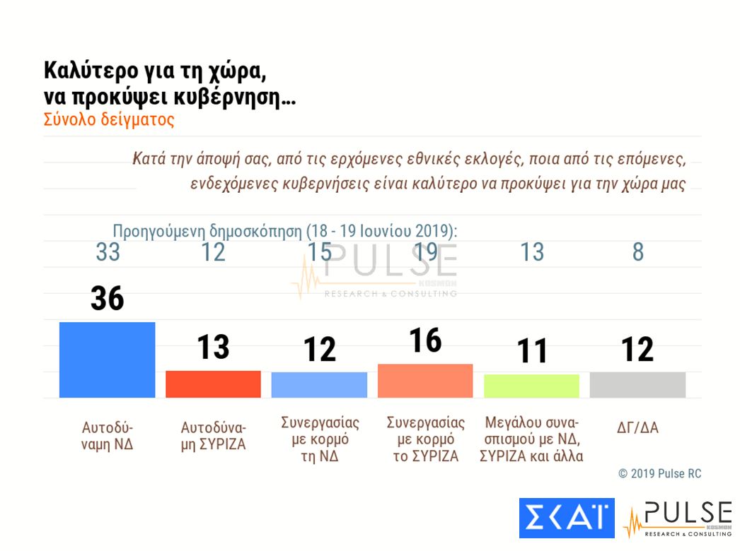 Οι πολίτες εμφανίζονται μοιρασμένοι ως προς το ποια κυβέρνηση θα είναι καλό να προκύψει για την χώρα. Το 36% απαντά ότι θα ήταν καλύτερη μία αυτοδύναμη κυβέρνηση της ΝΔ και το 16% μία κυβέρνηση συνεργασίας με κορμό τον ΣΥΡΙΖΑ.