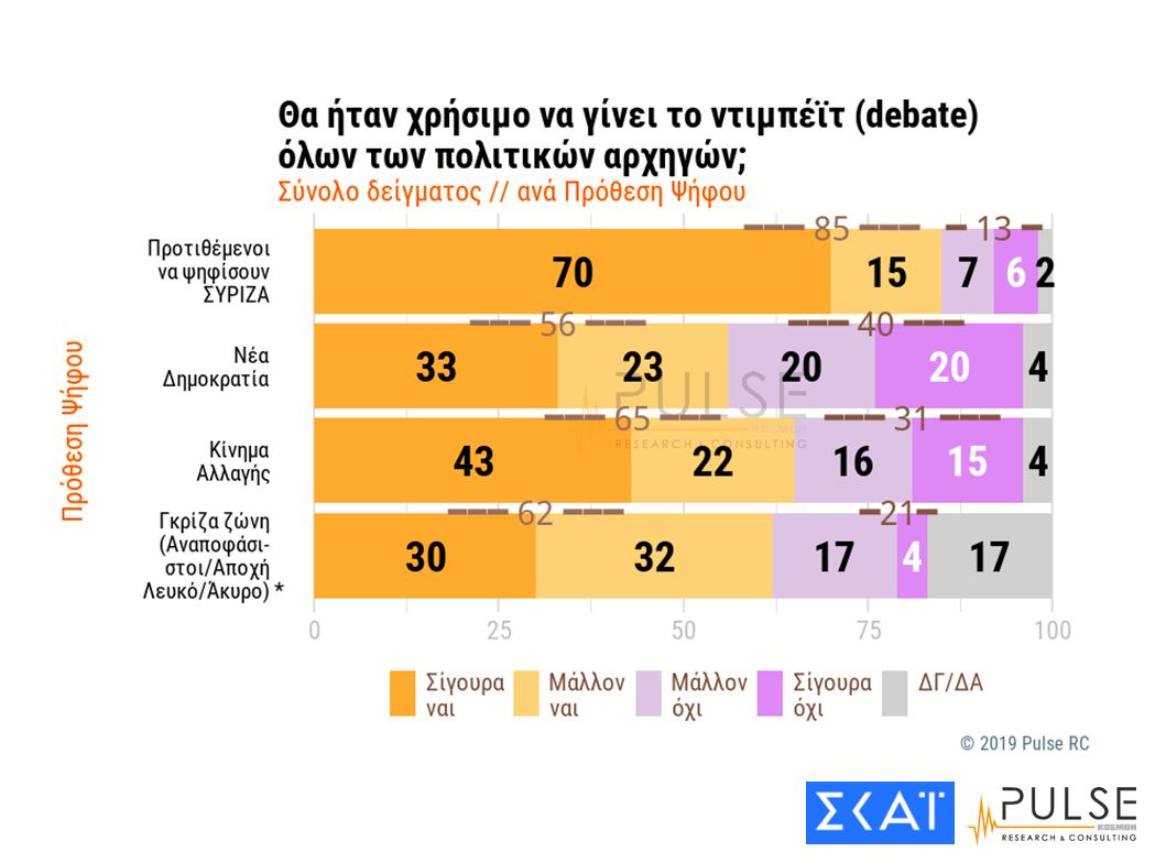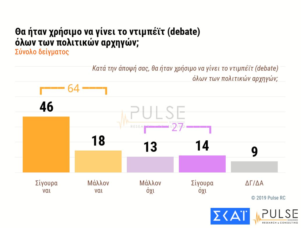 Η συντριπτική πλειοψηφία των πολιτών, δηλαδή το 64%, υποστηρίζει ότι θα ήταν χρήσιμο να γίνει ένα ντιμπέιτ μεταξύ των πολιτικών αρχηγών. Μόλις το 27% απαντά ότι μάλλον/σίγουρα δεν θα ήταν χρήσιμο και το 9% δεν γνωρίζει/δεν απαντά.