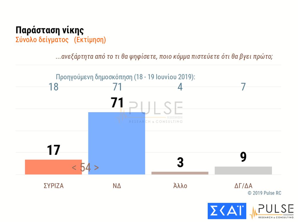 Προβάδισμα 9 μονάδων στην ΝΔ, δίνει νέα δημοσκόπηση της Pulse για τον ΣΚΑΪ, η οποία καταγράφει το προφίλ των αναποφάσιστων και τις προτιμήσεις τους, τα σενάρια για την κατανομή των εδρών στην Βουλή μετά την κάλπη της 7ης Ιουλίου και εάν θέλουν την διεξαγωγή ντιμπέιτ οι ψηφοφόροι της ΝΔ και του ΣΥΡΙΖΑ.