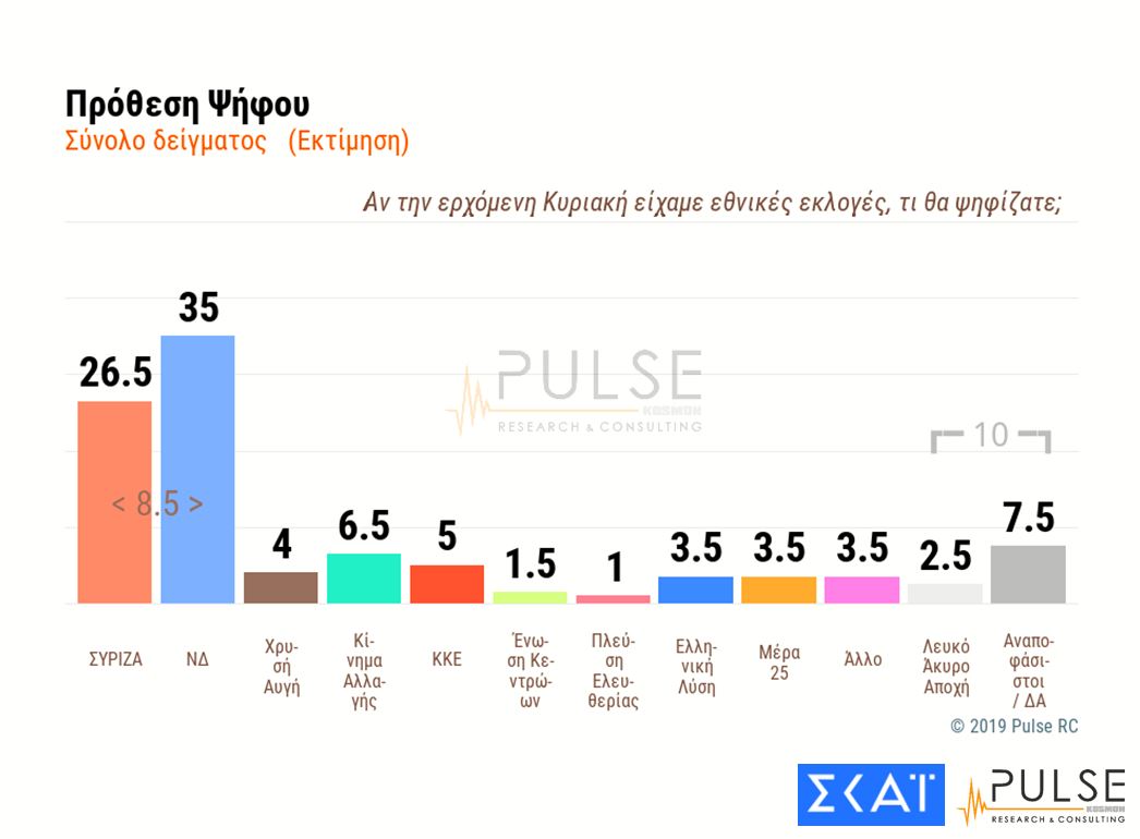 Στην εκτίμηση της πρόθεσης ψήφου η ΝΔ βρίσκεται στην πρώτη θέση με το 35% των προτιμήσεων των ψηφοφόρων και ακολουθεί ο ΣΥΡΙΖΑ με 26,5%. Το ΚΙΝΑΛ έρχεται τρίτο με ποσοστό 6,5%. Το ΚΚΕ λαμβάνει το 5% των ψήφων και η Χρυσή Αυγή το 4%. Στο όριο εισόδου στην Βουλή βρίσκονται η Ελληνική Λύση και το Μέρα25 που συγκεντρώνουν από 3,5% αντίστοιχα. Η Ένωση Κεντρώων λαμβάνει 1,5% και η Πλεύση Ελευθερίας 1%. Άλλο κόμμα απαντά το 3,5%, ενώ το λευκό, άκυρο, αποχή και οι αναποφάσιστοι φτάνουν στο 10%.