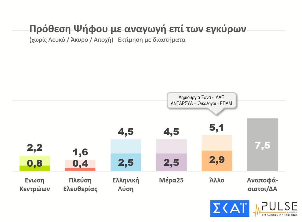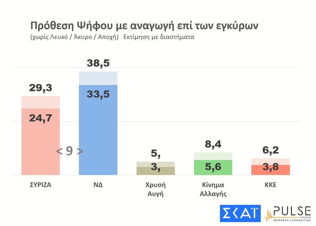 Αναλυτικότερα, η εκτίμηση για την πρόθεση ψήφου με αναγωγή επί των εγκύρων για τα υψηλότερα και τα χαμηλότερα ποσοστά των κομμάτων, δείχνει ότι το ποσοστό της ΝΔ θα κυμανθεί από 33,5% έως 38,5%. Ακολουθεί ο ΣΥΡΙΖΑ με 24,7% έως 29,3%, το ΚΙΝΑΛ με 8,4%-5,6%, το ΚΚΕ με 6,2% - 3,8%, η Χρυσή Αυγή με 5%-3%. Το άλλο κόμμα (δηλαδή Δημιουργία Ξανά, ΛΑΕ, ΑΝΤΑΡΣΥΑ, Οικολόγοι, ΕΠΑΜ) κυμαίνεται από 2,9% έως 5,1%, το Μέρα25 από 2,5% έως 4,5%, η Ελληνική Λύση από 2,5% έως 4,5% και οι αναποφάσιστοι και όσοι δεν απαντούν στο 7,5%.