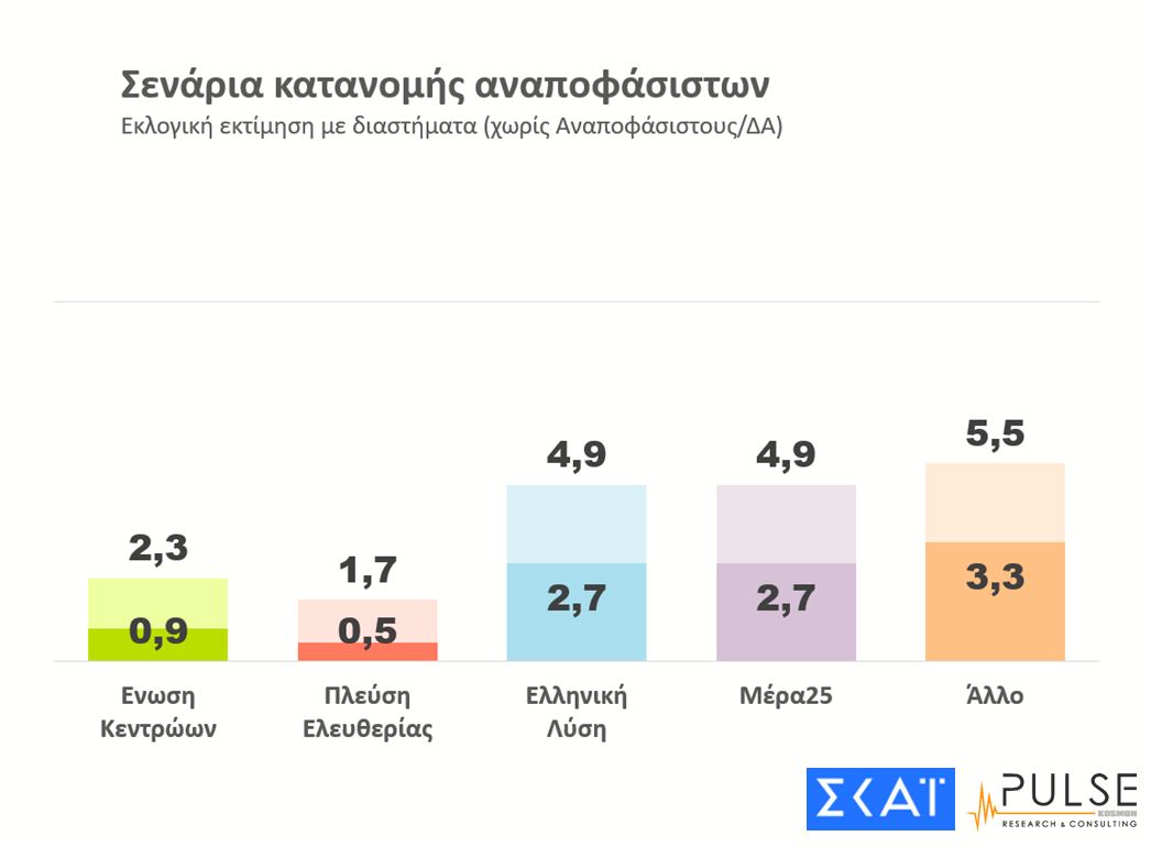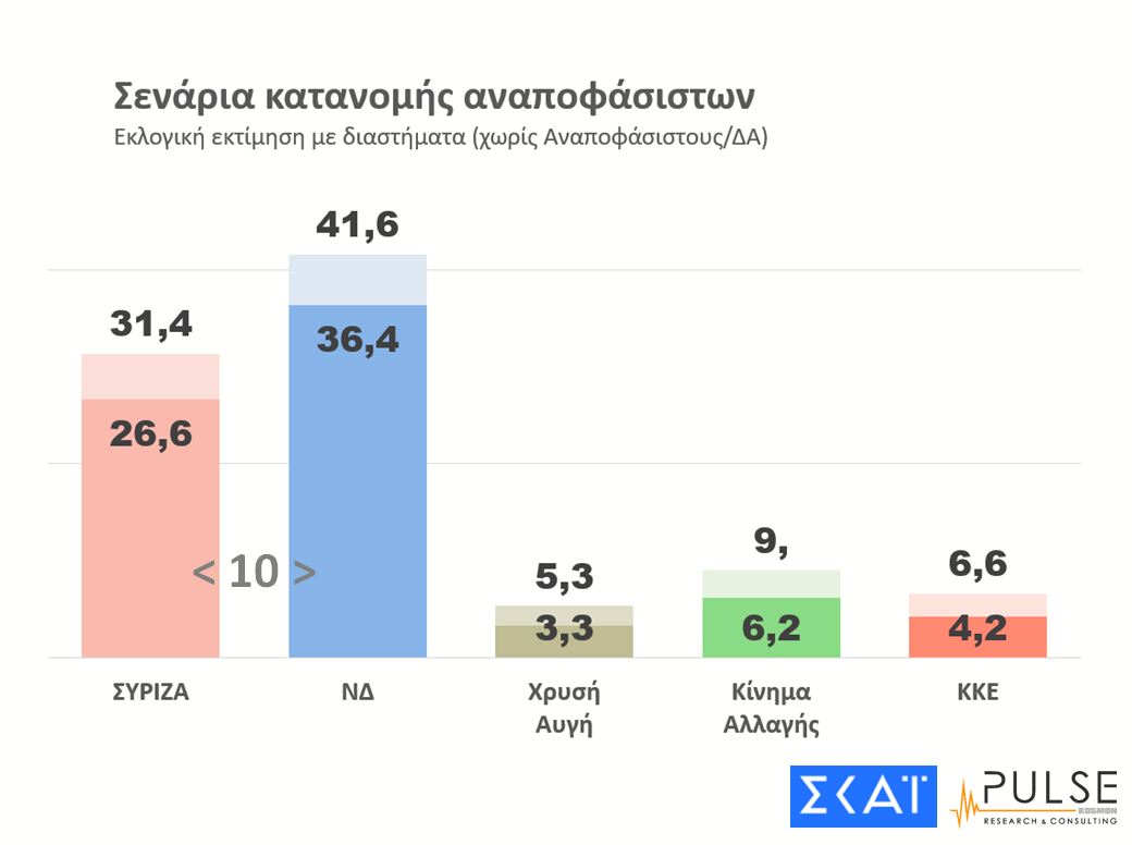 Η εκλογική εκτίμηση των κομμάτων εάν κατανεμηθούν οι αναποφάσιστοι και όσοι δεν απαντούν δίνει ποσοστό από 36,4% έως 41,6% στην ΝΔ και από 26,6% έως 31,4% στον ΣΥΡΙΖΑ. Από 6,2% έως 9% λαμβάνει το ΚΙΝΑΛ και από 4,2% έως 6,6% συγκεντρώνει το ΚΚΕ. Η Χρυσή Αυγή λαμβάνει από 3,3% έως 5,3%. Από 2,7% έως 4,9% λαμβάνουν Ελληνική Λύση και Μέρα25 αντίστοιχα. Η Ένωση Κεντρώων κυμαίνεται από 0,9% έως 2,3% και η Πλεύση Ελευθερίας από 0,5% έως 1,7%. Το άλλο κόμμα κυμαίνεται από 3,3% έως 5,5%.