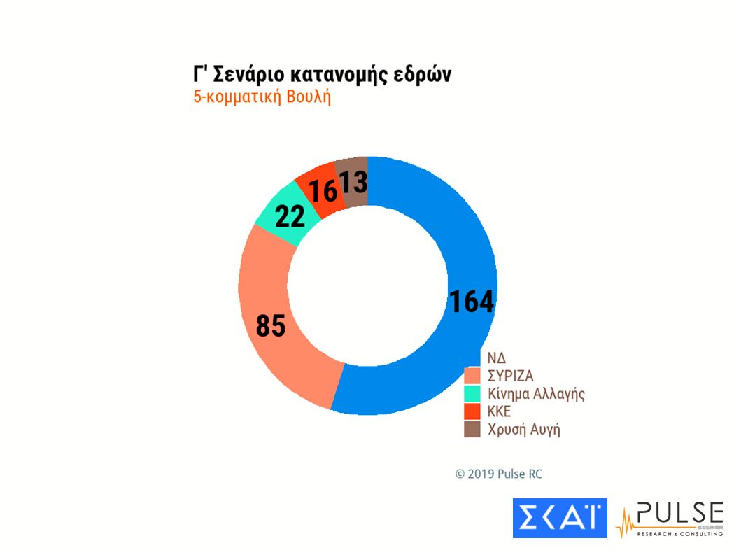 Στο τρίτο σενάριο η Βουλή θα είναι πεντακομματική, δηλαδή μένουν εκτός Βουλής Ελληνική Λύση και Μέρα25. Σε αυτή την περίπτωση η ΝΔ θα λάβει 164 έδρες. Ο ΣΥΡΙΖΑ συγκεντρώνει 85 έδρες, το ΚΙΝΑΛ 22 έδρες, το ΚΚΕ 16 έδρες και η Χρυσή Αυγή 13 έδρες.