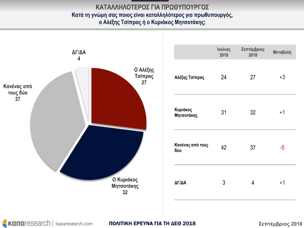 Όσο αφορά στο ερώτημα ποιος είναι καταλληλότερος πρωθυπουργός, ο Κυριάκος Μητσοτάκης συγκεντρώνει 32% ενώ ο Αλέξης Τσίπρας 27%.