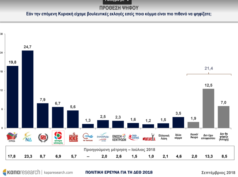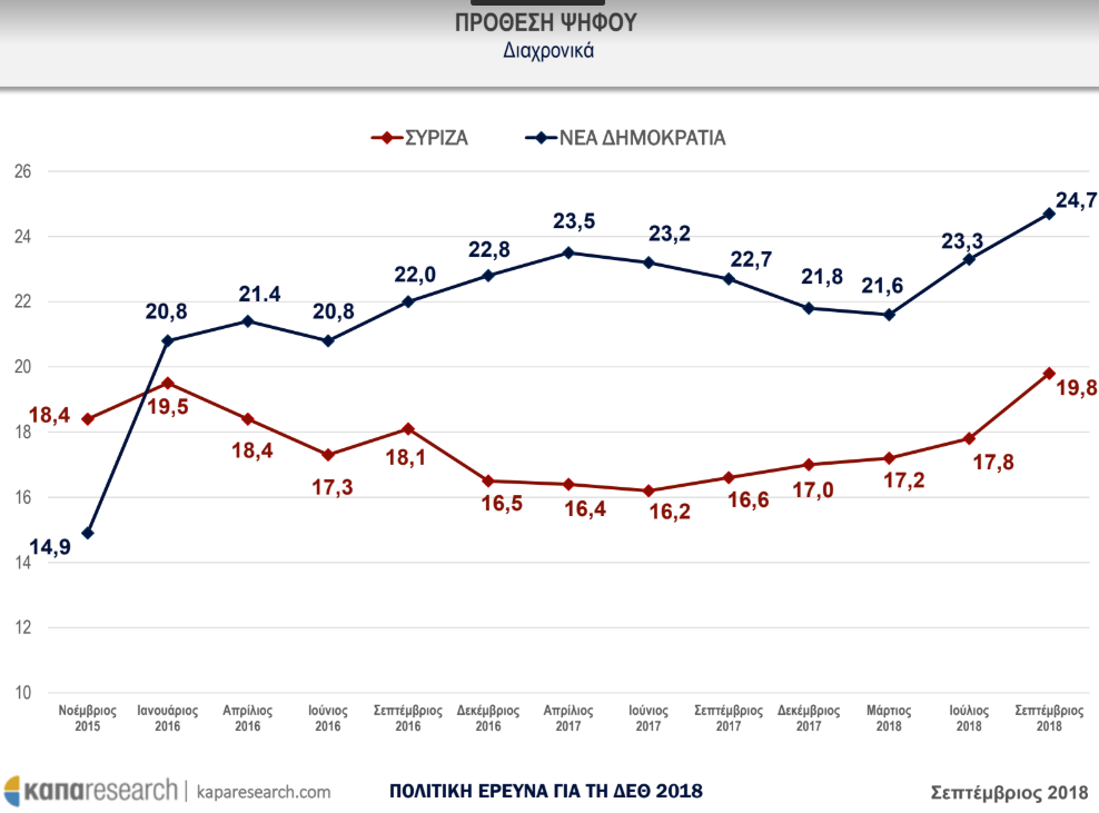 Σύμφωνα με δημοσκόπηση της Κάπα Research η ΝΔ συγκεντρώνει ποσοστό 24,7% ενώ ο ΣΥΡΙΖΑ βρίσκεται στο 19,8%. Τρίτο κόμμα αναδεικνύεται η Χρυσή Αυγή με 7,9% και ακολουθούν Κίνημα Αλλαγής (6,7%) και ΚΚΕ (5,6%).