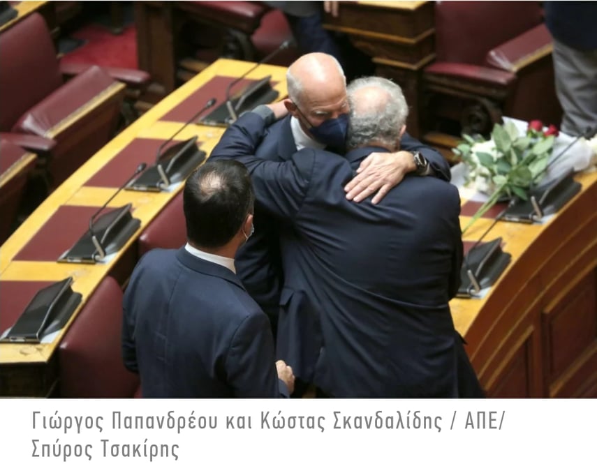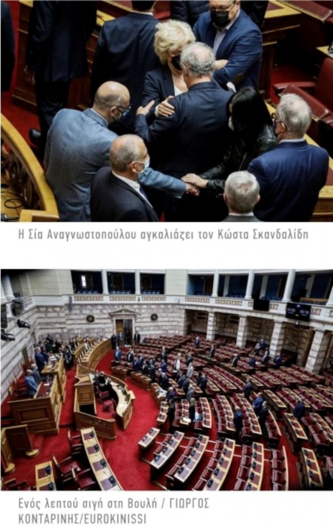 Ο Γιώργος Παπανδρέου έπεσε στην αγκαλιά του Κώστα Σκανδαλίδη και κάθισαν και οι δύο στις θέσεις ακριβώς δίπλα στα έδρανα που καθόταν πάντα η πρόεδρος του ΚΙΝΑΛ, βουβοί, με το κεφάλι σκυφτό. Απαρηγόρητη, δεν έκρυψε τα δάκρυά της και η βουλευτής της Νέας Δημοκρατίας Άννα Καραμανλή.