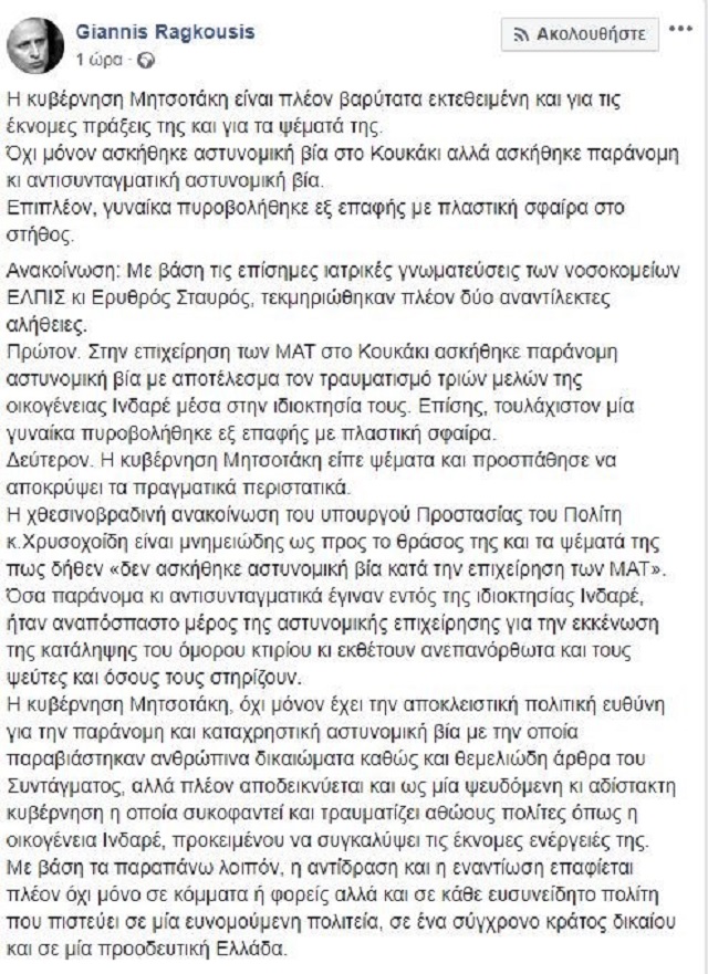 «Η κυβέρνηση έχει ξεπεράσει κάθε όριο και είπε ψέμματα λέγοντας ότι δεν ασκήθηκε βία στο Κουκάκι, δήλωσε στην εκπομπή «Καλημέρα Ελλάδα» και τον Γιώργο Παπαδάκη ο Γιάννης Ραγκούσης.