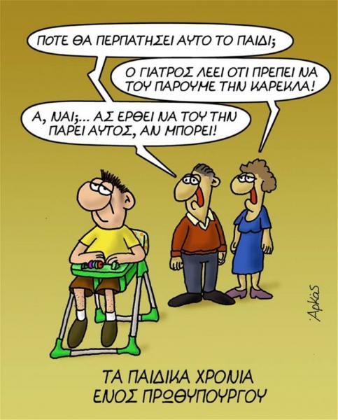 Σε αυτό βλέπουμε τους γονείς του… μέλλοντος πρωθυπουργού να συζητούν για πότε θα περπατήσει το παιδί τους. "Ο γιατρός λέει ότι πρέπει να του πάρουμε την καρέκλα" απαντά η μητέρα με τον πατέρα να σχολιάζει με νόημα "α, ναι;… Ας έρθει να του την πάρει αυτός, αν μπορεί".