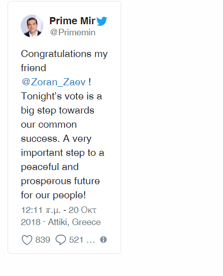 Απευθυνόμενος σε β’ ενικό πρόσωπο, ο κ. Τσίπρας συγχαίρει τον φίλο του Ζόραν Ζάεφ, και επισημαίνει ότι «η αποψινή ψηφοφορία είναι ένα μεγάλο βήμα προς την κοινή επιτυχία. Ένα πολύ σημαντικό βήμα σε ένα ειρηνικό και ευημερές μέλλον για τους λαούς μας!»