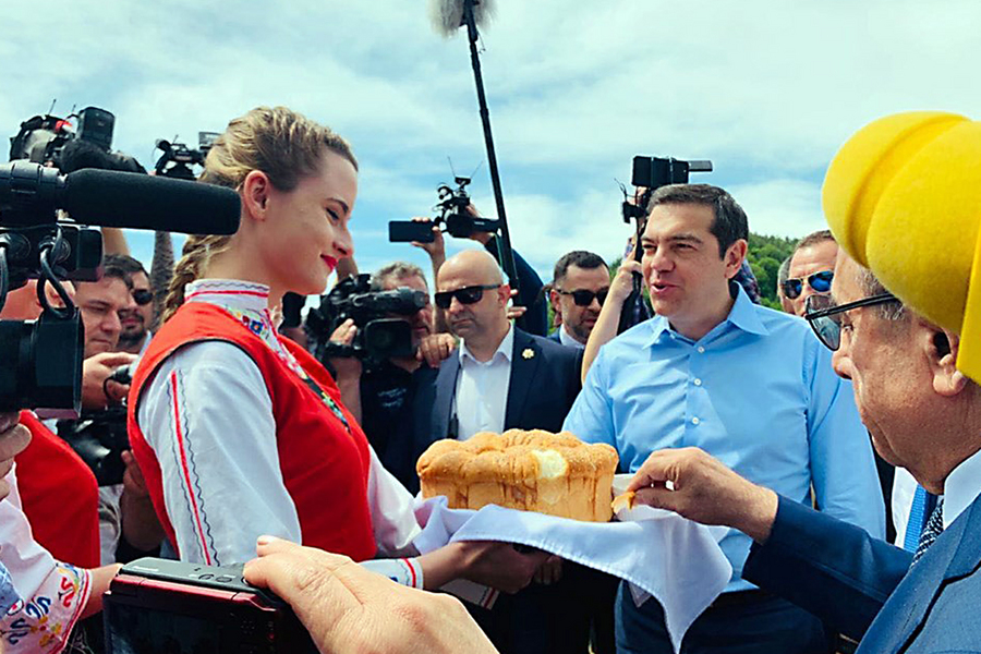 Τον πρωθυπουργό Αλέξη Τσίπρα υποδέχθηκαν δύο νεαρές, ντυμένες με παραδοσιακές στολές, πρόσφεραν στον κ. Τσίπρα ψωμί και μέλι.