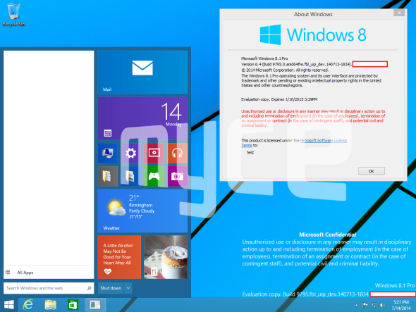 Η ιστιοσελίδα myce είναι γνωστή για τις αποκαλύψεις της σχετικά με την Microsoft και αυτή την φορά δημοσίευσε 2 screenshots από τα επερχόμενα Windows 9. Στις φωτογραφίες διακρίνουμε το Start Menu καθώς και μία εφαρμογή που τρέχει σε Windows Mode. Τα screenshots έχουν ημερομηνία 14 Ιουλίου από την έκδοση #9795 οπότε ίσως αυτό που βλέπουμε να μην είναι η τελική εκδοχή