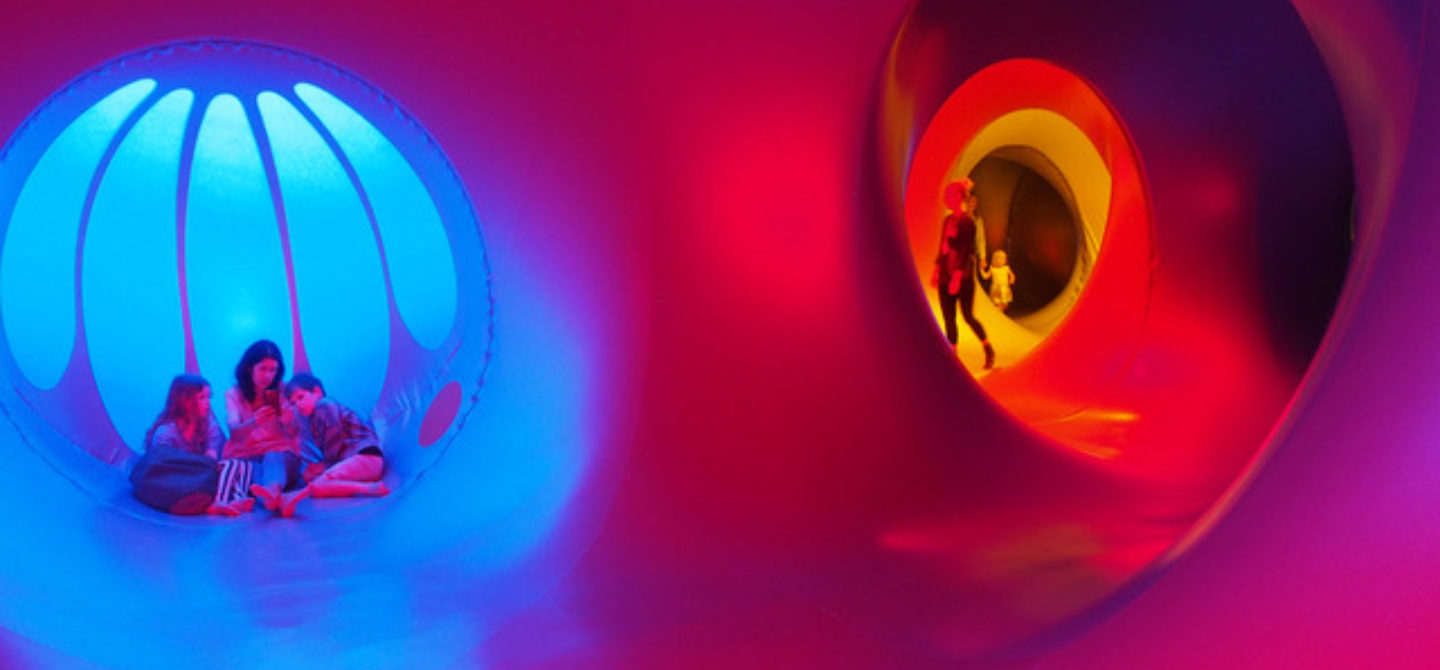Φως πλημμυρίζει τα τούνελ του λαβυρίνθου, περνώντας μέσα από χρωματιστά πάνελ από διαφανές υλικό και λούζοντας το εσωτερικό με φωτεινές και αιθέριες αποχρώσεις.